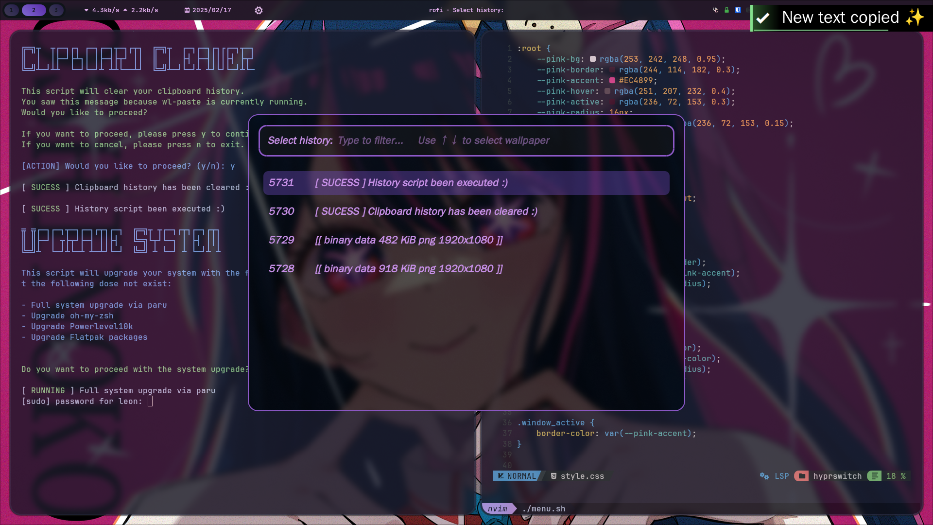This setup script checks whether git and paru are installed. If they are not, it will install them, then clone the dotfiles repository and copy the configurations to your system. Alternatively, you can clone my dotfiles and run the install.sh script manually: